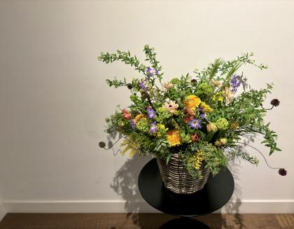季節のお花を盛り込んだアレンジメントになります。仕入れ状況により種類が異なる事がございます。あらかじめご了承ください。